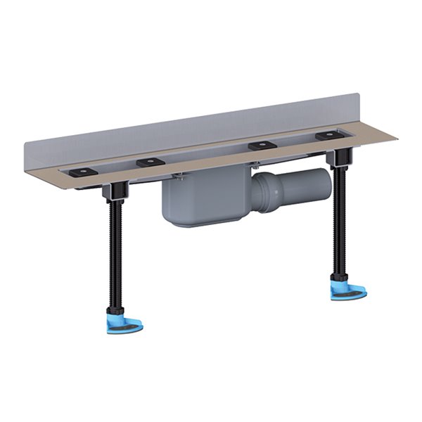 Grondaia doccia inox per scarico lineare a parete, senza copertura. Corpo della grondaia con flangia e bordo sabbiato per l'unione a malte cementizie idroisolanti, corpo di scarico in PP, deflusso orizzontale con giunzione sferica DN50. Sifone estraibile per facile pulizia. Capacità di scarico 0,8 l/s. Inclusi 2 piedini di montaggio insonorizzati e regolabili, 2 angolari di fissaggio con viti, tasselli e nastro insonorizzati, nastro per la impermeabilizzazione della parete. Copertura di protezione. Flangia lunghezza totale 600mm.