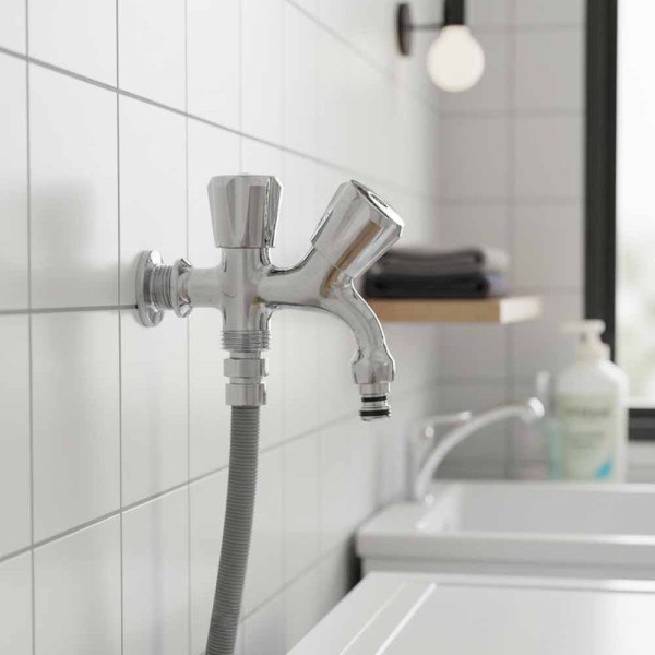 Il rubinetto è dotato di attacco standard 1/2" maschio – 3/4" femmina e finitura cromata lucida che assicura un aspetto elegante e una lunga durata contro corrosione e usura. L’uscita doppia consente un utilizzo pratico e funzionale, garantendo flusso costante e sicurezza d’impiego.