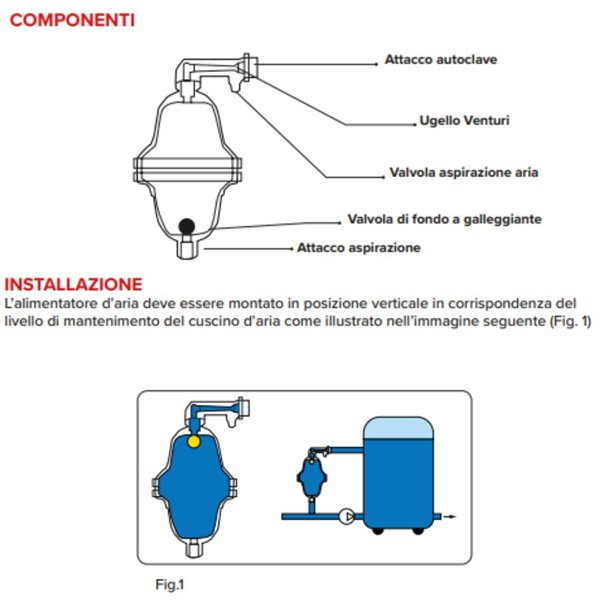 Il funzionamento è basato su un dispositivo costituito da un recipiente dotato di valvola di fondo a galleggiante e valvola di aspirazione aria. Quando attraversata dal flusso d'acqua, la valvola aspira aria dall'esterno per effetto Venturi. A pompa attiva, l'acqua passa attraverso l'ugello Venturi creando una depressione che aspira aria nel sistema. A pompa ferma, prosegue il sufflaggio dell'aria nell'autoclave, mantenendo costante il cuscino d'aria.