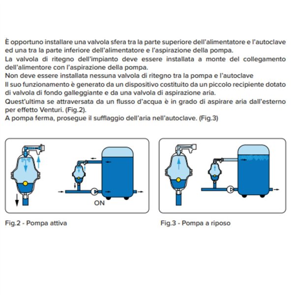 Il corretto funzionamento comporta un'aspirazione dell'aria di circa 30 secondi ad ogni avviamento della pompa. Questa condizione si ottiene regolando la valvola a sfera posta sull'aspirazione della pompa. Per ottenere un cuscino d'aria sufficiente possono essere necessari alcuni giorni di regolare funzionamento.