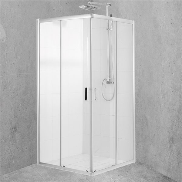 Parete doccia Lofty lato per angolo con apertura scorrevole laterale, dimensione L65 cm – H200 cm, in cristallo trasparente 6 mm conforme EN12150-1. Profili in alluminio cromato lucido e maniglie coordinate. Estensibilità 63÷65 cm.