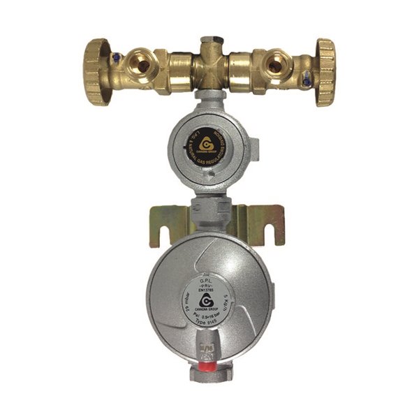 Regolatore/inversore a doppio stadio con valvola di sicurezza per lo scarico delle sovrapressioni è progettato per fornire un controllo avanzato e sicuro del gas GPL, ideale per installazioni esterne.