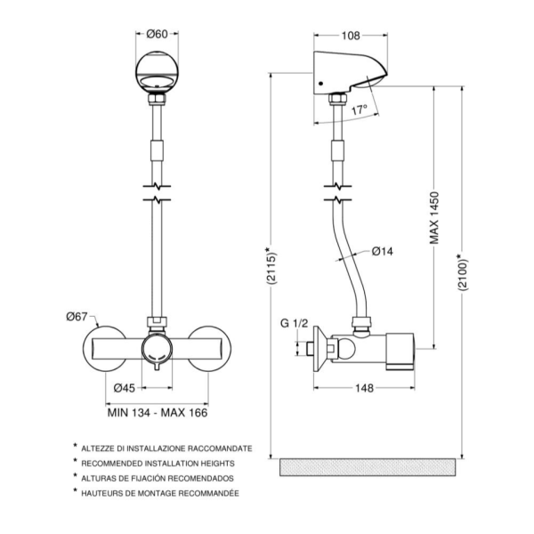 Il miscelatore consente la regolazione della temperatura e l’azionamento tramite una pratica maniglia, con arresto temporizzato di 25 secondi a 3 bar (regolabile).