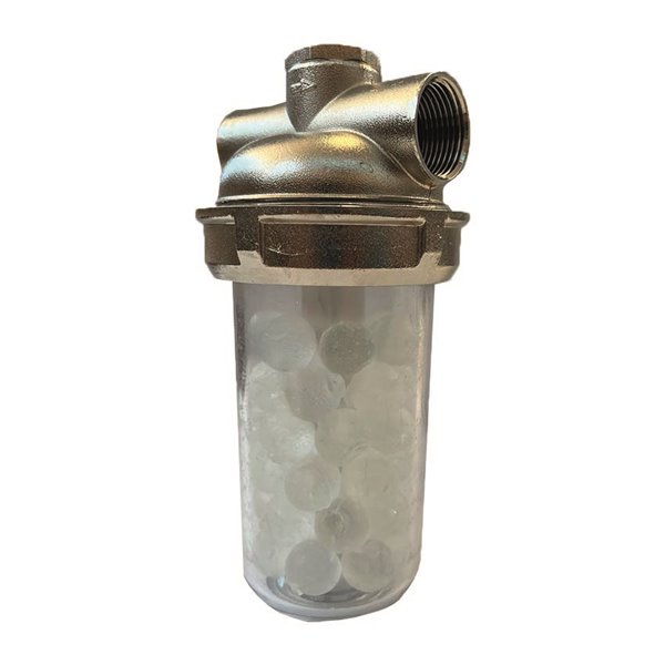 Il dosatore Spin 3/4" ff con ricarica rappresenta un'innovativa soluzione per dosare polifosfati sferici in modo preciso ed efficace, offrendo una protezione affidabile contro la formazione di incrostazioni calcaree e fenomeni corrosivi negli impianti di distribuzione di acqua calda sanitaria.