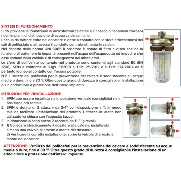L'utilizzo dei polifosfati per la prevenzione del calcare è soddisfacente su acque medie o dure fino a 30°f. Oltre questo grado di durezza è consigliabile l'installazione di un addolcitore a protezione dell'intero impianto. Le sfere di polifosfato sono conformi agli standard EC (EN 1208). Conforme DLgs 31/2001, DM 25/2012 e DM 174/2004, idoneo al contatto con acqua potabile.