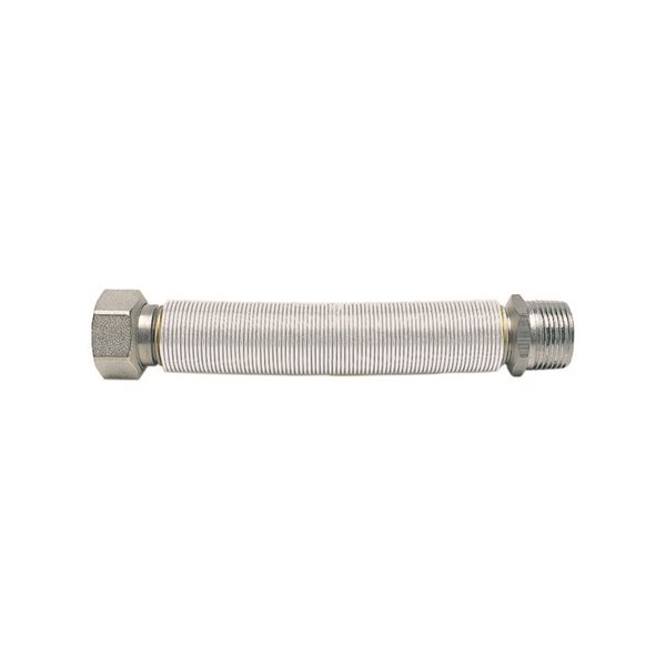 Giunto estensibile per acqua 1/2"x3/4" MF – 220–420 mm, realizzato in acciaio inox AISI 316L con dado in ottone nichelato e guarnizioni NBR. Flessibile, resistente e ideale per impianti idrici e termici, con pressione fino a 5,5 bar.