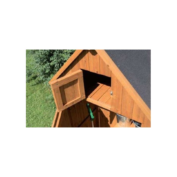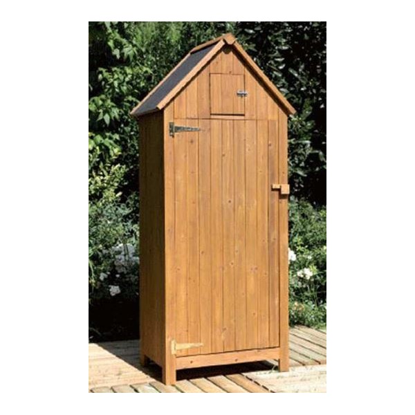 Con 3 ripiani e scrigno separato nella parte superiore, 1 anta di chiusura, tetto a 2 falde con guaina impermeabile. Trattato con impregnante color miele che lo proteggono dagli agenti atmosferici, legno di abete soggetto all'ossidazione dei raggi UV, è consigliata una manutenzione periodica per un ravvivamento estetico.
