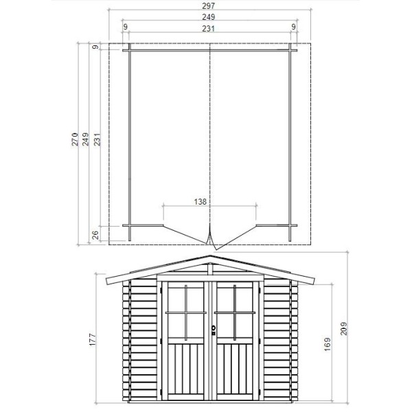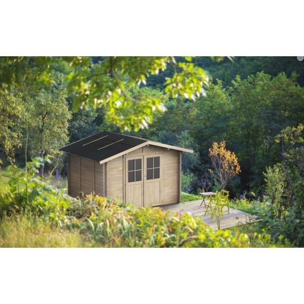 Dotata di una porta doppia a battente, completa di una finestra fissa in plexiglass e un telaio in Finger Joint, offre un ingresso luminoso e accogliente. Il tetto è costituito da falde in perlinato di abete da 16mm, protette da una copertura in guaina ardesiata grigia da 3mm, garantendo una protezione affidabile dalle intemperie.