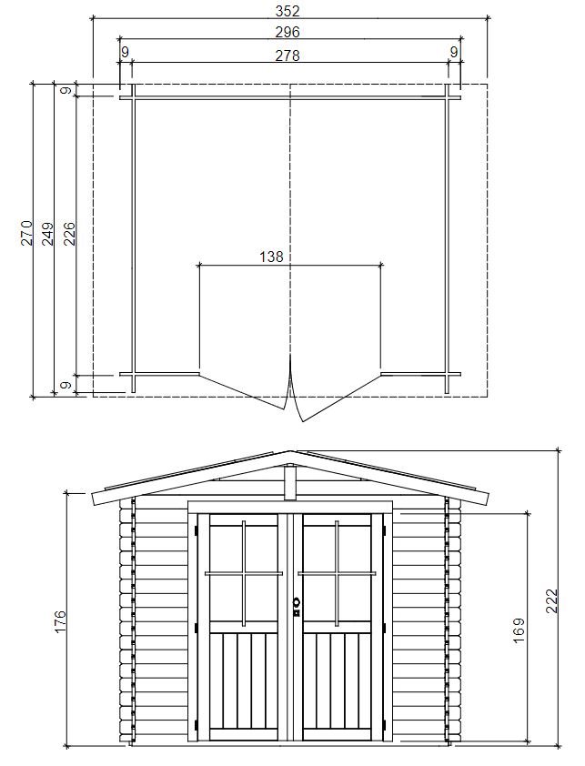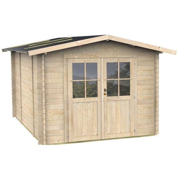 Dotata di una porta doppia a battente, completa di una finestra fissa in plexiglass e un telaio in Finger Joint, offre un ingresso luminoso e accogliente. Il tetto è costituito da falde in perlinato di abete da 16mm, protette da una copertura in guaina ardesiata grigia da 3mm, garantendo una protezione affidabile dalle intemperie.