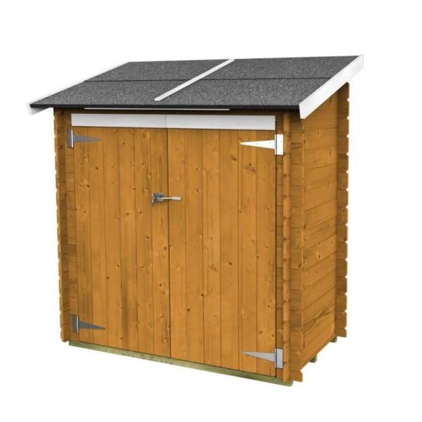 L'ingresso è caratterizzato da una porta doppia cieca a battente, che aggiunge un tocco di eleganza e praticità alla casetta. Il tetto, con le sue falde in pannello OSB3 spessore 12mm, è protetto da una copertura in guaina ardesiata grigia da 3mm, assicurando una perfetta protezione dalle intemperie.