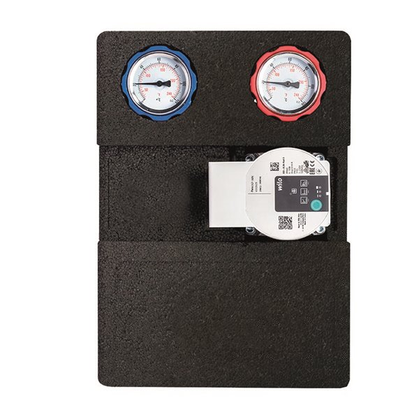 Il gruppo di rilancio è dotato di due valvole di intercettazione a sfera con termometro incorporato per la lettura istantanea delle temperature di mandata e ritorno (sulla valvola a sfera di ritorno è incorporata la valvola di ritegno) e una valvola a sfera per intercettare il circolatore.