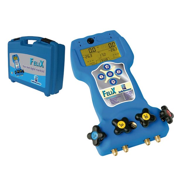 Gruppo manometrico digitale FOX 100 a 4 vie a pistone per la manutenzione e la diagnosi degli impianti HVAC e A/C con oltre 50 tipi di refrigerante presenti nel data base