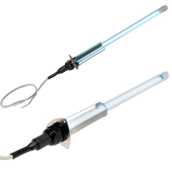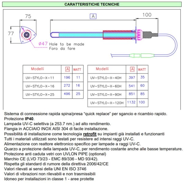 Lampada germicida UV-C Light Progress UV-STYLO-X 25 con alimentatore e spia LED. Bulbo in quarzo, flangia inox AISI 304, IP40. Installazione semplice su impianti HVAC/fan coil con foro da 50 mm. Durata fino a 18.000 ore.