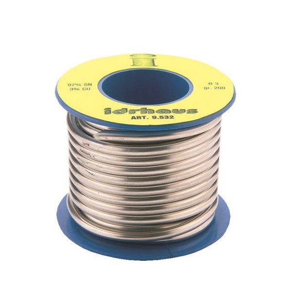 Saldante in filo di stagno e rame Ø 3: idoneo per impianti in rame di acqua fredda, calda e gas. Composizione: sn 97% cu 3%. Ø 3, L-CU3 sn, temperatura di fusione 230-250 C°.