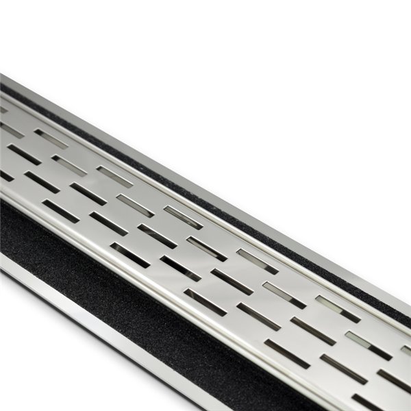 La canaletta in acciaio inox lucido della linea Ram, con una lunghezza regolabile da 685 mm a 735 mm, è un elemento elegante e funzionale progettato per il drenaggio efficiente dell'acqua.