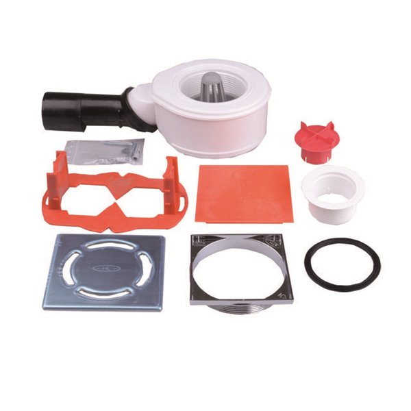 Sifone completo per HL523N, composto da scarico per elementi sotto-piastrella per docce con uscita regolabile da orizzontale a verticale DN50, dispositivo antiodore estraibile, cornice cromata 121x121mm avvitabile per la regolazione in altezza, griglia inox 115x115mm, tappo di protezione e protezione quadra per il cantiere, staffa di fissaggio.