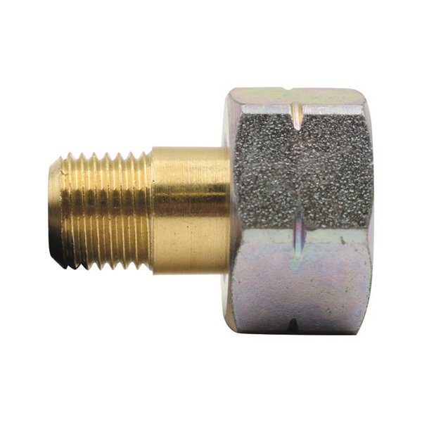 Raccordo adattatore in ottone da attacco italiano maschio a tedesco/francese femmina. Filettatura italiana M W20x1/14" sinistra, filettatura tedesca/francese F W21,8x1/14" sinistra. Ideale per collegare regolatori italiani a bombole tedesche o francesi. 1/4" maschio-femmina.