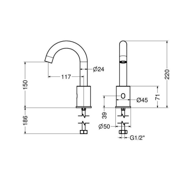 Rubinetto elettronico lavabo Idral serie CURVE, modello 02503/1RPT, con comando a fotocellula per un’attivazione a rilevamento di presenza. Dotato di alimentazione da rete 230V e premiscelatore termostatico, assicura comfort e igiene ottimali. Sistema di chiusura antivandalo dopo 1 minuto di erogazione continua e funzione anti-ristagno con erogazione automatica ogni 24 ore dall’ultimo utilizzo. Prestazioni elevate con portata limitata a 6 l/min e compatibilità con pressioni da 1 a 8 bar.