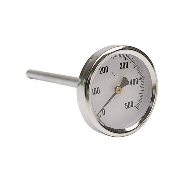 Termometro bimetallico con attacco posteriore, quadrante Ø80mm, guaina L.100mm, scala -30°/+50°C. Cassa acciaio zincato, attacco ottone 1/2", gambo acciaio zincato Ø9mm. Elemento spirale bimetallica, classe precisione 2, IP31. Conforme UNI EN 13190.