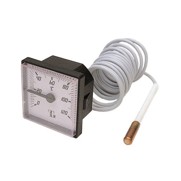 Termometro ad incasso con cassa Ø42 mm, capillare da 1,5 metri rivestito in PVC e scala 0–120°C. Ideale per monitoraggio temperatura in impianti termici e apparecchiature compatte. Disponibile anche la versione Ø52 inox 50–350°C.