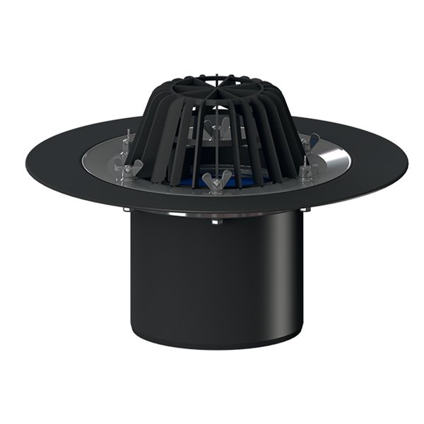 Scarico terrazzi DN160, griglia plastica raccoglifoglie, sistema di fissaggio per impermeabilizzazione