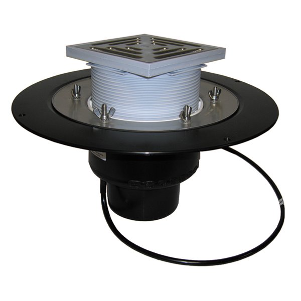 Scarico verticale DN125 con corpo a coibentazione termica e dispositivo di riscaldamento automatico per l'allacciamento alla rete 230 V (10 - 30 W), flangia isolante e elemento di fissaggio per lastre isolanti, telaio regolabile 20 - 68 mm / 147 x 147 mm e griglia in acciaio inox 139 x 139 mm. La confezione contiene anche il coperchio di protezione per il montaggio
