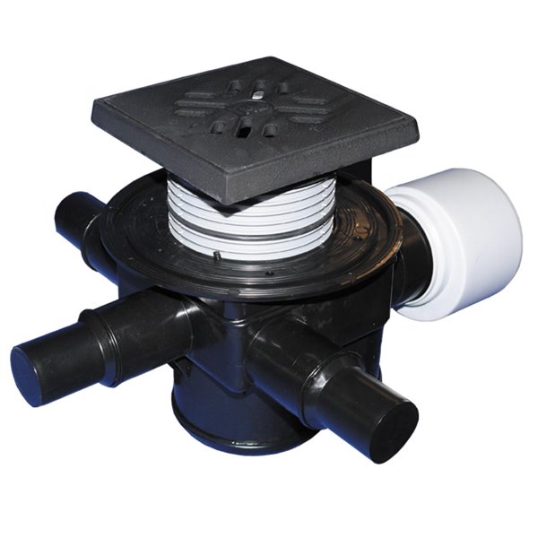 Pozzetto pavimento DN75/110, valvola antiriflusso, 3 entrate DN50/40, portagriglia telaio/griglia ghisa 150x150mm/137x137mm