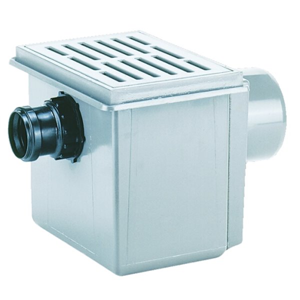 Pozzetto sifonato per cantina deflusso orizzontale DN110 con entrata supplementare DN75, griglia in plastica 170x240mm e griglia 155x225mm, cestello raccoglisporco, livello d'acqua 60mm, portata max 300Kg - classe di carico K3
