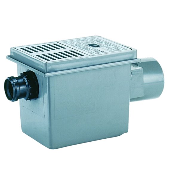 Pozzetto sifonato per cantina con antiriflusso triplo (2 automatici, 1 manuale), entrata supplementare DN50, griglia in plastica con piastra di apertura per manutenzione 180x125mm,