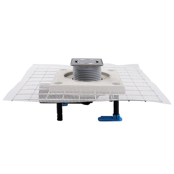Scarico a pavimento DN50/75 „Cera Drain“ con collare in cemento polimerico regolabile in altezza, adatto per impermeabilizzazioni alternative specialmente per l’incollaggio con pavimentazioni ceramiche , scarico regolabile da orizzontale a verticale , dispositivo antiodore , prolunga accorciabile 0 - 55 mm / 100 x 100 mm e griglia in acciaio 94 x 94 mm. Protezione di montaggio compresa nella confezione. Le impermeabilizzazioni CeraDrain sono la soluzione ideale nelle moderne pavimentazioni a basso spessore. Il collare in cemento polimerico, grazie alle viti di regolazione, viene inserito in modo tale che la posa del cemento faccia presa direttamente sul collare.la griglia fa presa nel cemento ed evita movimenti indesiderati. Durante la posa del materiale isolante, viene inserita anche una lastra in fibra di vetro come ulteriore rinforzo nell’allacciamento del corpo al pavimento. La prolunga non ha piu funzione di impermeabilizzante (basta silicone!) e lo scarico e per sempre isolato!