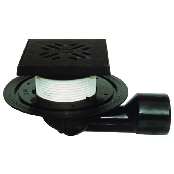 Scarico per pavimenti DN50/75, flangiato, con deflusso snodato 0°-90°, sifone estraibile con livello d'acqua 50mm, portagriglia in plastica 34-73mm, telaio in ghisa 150x150mm e griglia in ghisa 137x137mm, portata max 1,5t - clase di carico A