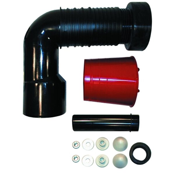 Curva di scarico per WC sospesi DN90/110 90°, accorciabile, con guarnizione brevettata provvista di supporto per l'innesto del vaso, tappo rosso conico di protezione e set di allacciamento HL226. Si adatta a qualsiasi tipo di staffa per vasi sospesi grazie alle scalanature di fissaggio