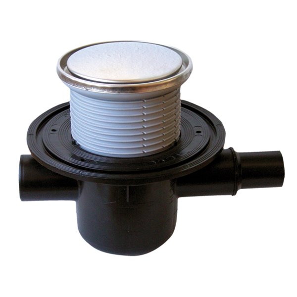 Scarico DN50 orizzontale per pavimenti con portagriglia rotonda in plastica d 131mm, griglia in acciaio inox rotonda d 112mm, sifone con valvola antiriflusso, entrata DN40/50