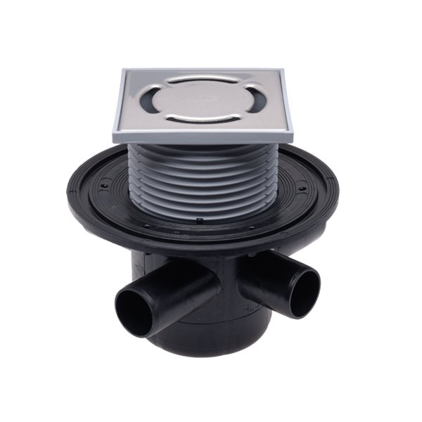 Pozzetto pavimento DN50 con 3 entrate DN40, antiriflusso, portagriglia 123x123mm, griglia inox 115x115mm