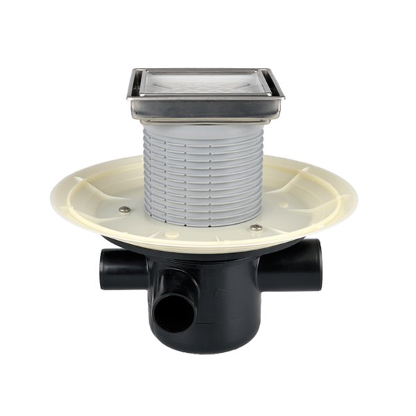 Scarico a pavimento DN50 orizzontale con flangia di impermeabilizzazione, dispositivo antiodore con antiriflusso, 3 entrate laterali DN40, portagriglia piastrellabile con cornice inox 132x132 / 112x112mm, 10 - 80mm accorciabile. Protezione rotonda per il cantiere compresa nella fornitura.