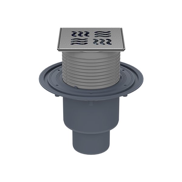 Scarico pavimento DN50/75/110 verticale con flangia d' impermeabilizzazione, blocco di odore, prolunga 10- 80 mm tagliabile, portagriglia clic-clac 121x 121 mm, griglia inox 115x 115 mm "Yukon" e telaio protezione. Protezione montaggio inclusa.