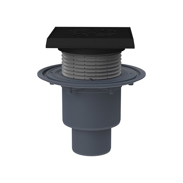 Scarico verticale DN50/75/110 per pavimenti, portagriglia in plastica 34-73mm/150x150mm, griglia in ghisa 137x137mm e dispositivo antiodore estraibile, portata max 1,5t, classe di carico L15