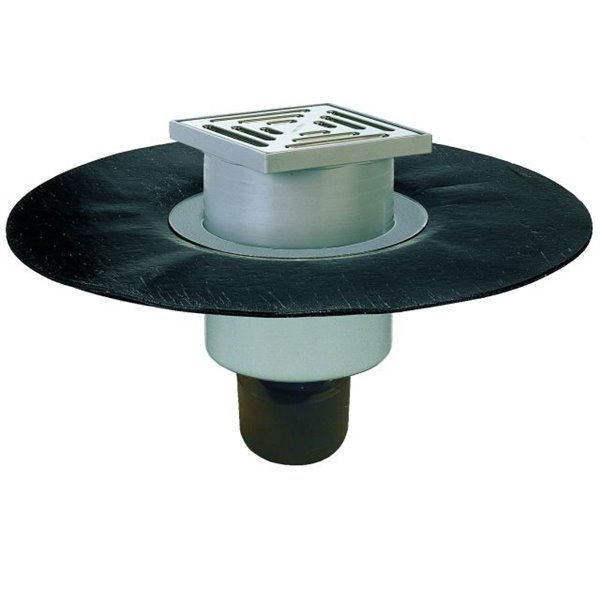 Pozzetto scarico verticale DN50/75/110 per pavimenti con guaina bitumata saldata per impermeabilizzazione, sifone estraibile, portagriglia 20-70mm/147x147mm, griglia in acciaio inox 139x139mm, portata max 300Kg, classe di carico K3, completo di cestello raccoglisporco e riduttore DN70/DN100.