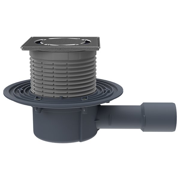 Scarico pavimento DN 40/50 orizzontale con flangia d'impermeabilizzazione, blocco di odore PRIMUS BLUE, prolunga 12- 80 mm tagliabile, portagriglia clic-clac 121x 121 mm, griglia inox 115x 115 mm e telaio protezione. Protezione montaggio inclusa.