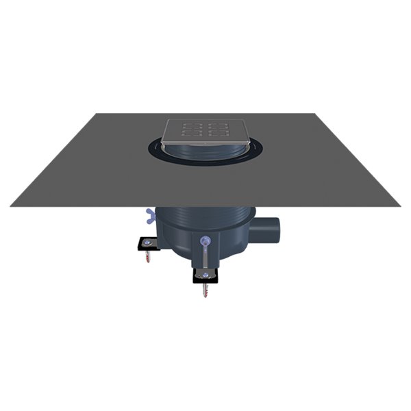 Scarico doccia " Primus - Drain” , con 3 angoli di regolazione fissati al fondo del pavimento ancora grezzo, il corpo di scarico può essere regolato in altezza . Il corpo di scarico si trova sul pavimento ancora grezzo senza conoscere l'altezza finale del massetto . Dopo la posa del massetto la parte in eccedenza può essere facilmente tagliata . Dopo aver inserito il kit impermeabilizzazione, il telaio può essere regolato all'altezza delle piastrelle . Il telaio può essere regolato all'altezza della piastrella e la cavità viene riempita con la piastrella .