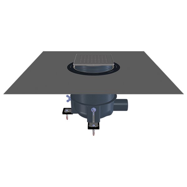 Scarico doccia " Primus - Drain” , con 3 angoli di regolazione fissati al fondo del pavimento ancora grezzo, il corpo di scarico può essere regolato in altezza . Il corpo di scarico si trova sul pavimento ancora grezzo senza conoscere l'altezza finale del massetto . Dopo la posa del massetto la parte in eccedenza può essere facilmente tagliata . Dopo aver inserito il kit impermeabilizzazione, il telaio può essere regolato all'altezza delle piastrelle . Il telaio può essere regolato all'altezza della piastrella e la cavità viene riempita con la piastrella .