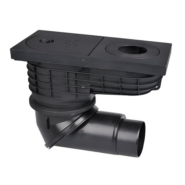 Scarico acqua piovana con coperchio visibile in ghisa, uscita DN110/125 con snodo sferico 360° (posizioni intermedie 0°-90°), raccogli foglie con troppo pieno incluso,coperchio di ispezione con maniglia e ingresso tubo di scarico acqua piovana da d 80,d110 e 120 regolabile .