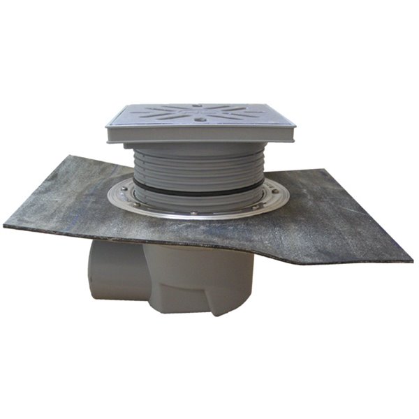 Scarico orizzontale 'Perfekt' DN110, foglio bitumato saldato, portagriglia plastica 240x240mm, griglia inox 226x226mm, raccoglis