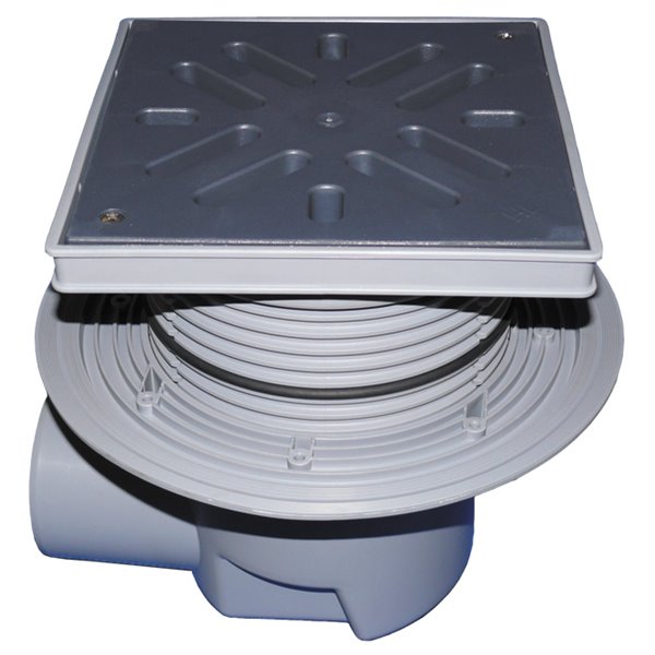 Scarico orizzontale 'Perfekt' DN110, flangiato, portagriglia/griglia plastica 240x240mm/226x226mm, raccoglisporco, dispositivo a