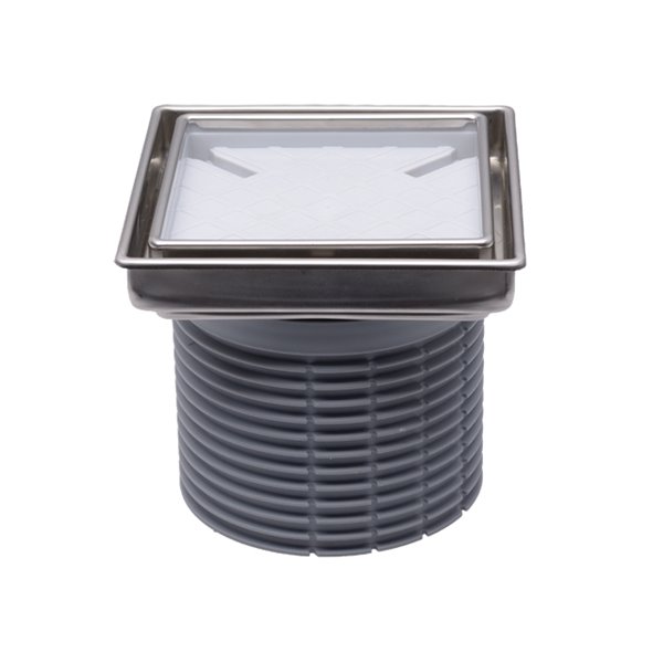 Portagriglia piastrellabile Ø 110mm / 132x132mm con cornice inox e porta-piastrella 112x112mm. Altezza totale 80mm, altezza cornice 10-27mm. Protezione quadra per il cantiere compresa nella fornitura.