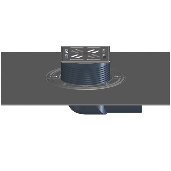 Scarico per balconi e terrazzi DN75 orizzontale con guaina bituminosa saldata in fabbrica, come collegamento ideale con impermeabilizzazioni bituminose, clapet antiodore resistente al gelo ed estraibile, portagriglia accorciabile 12 - 75 mm / 145 x 145 mm e griglia inox 138 x 138 mm, con protezione quadra per il cantiere. Griglia in plastica ferma-ghiaia e staffe di fissaggio comprese nella fornitura.